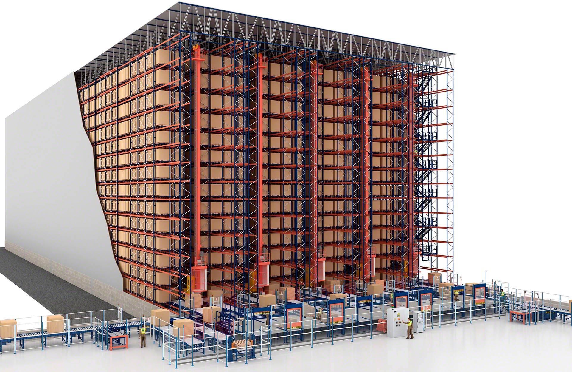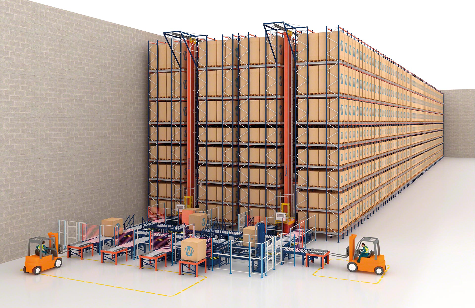 - Solução integral: A Mecalux projeta, fabrica, instala e coloca em marcha todos os componentes do armazém automático, desde estantes, transelevadores e transportadores até softwares de controlo e de gestão.