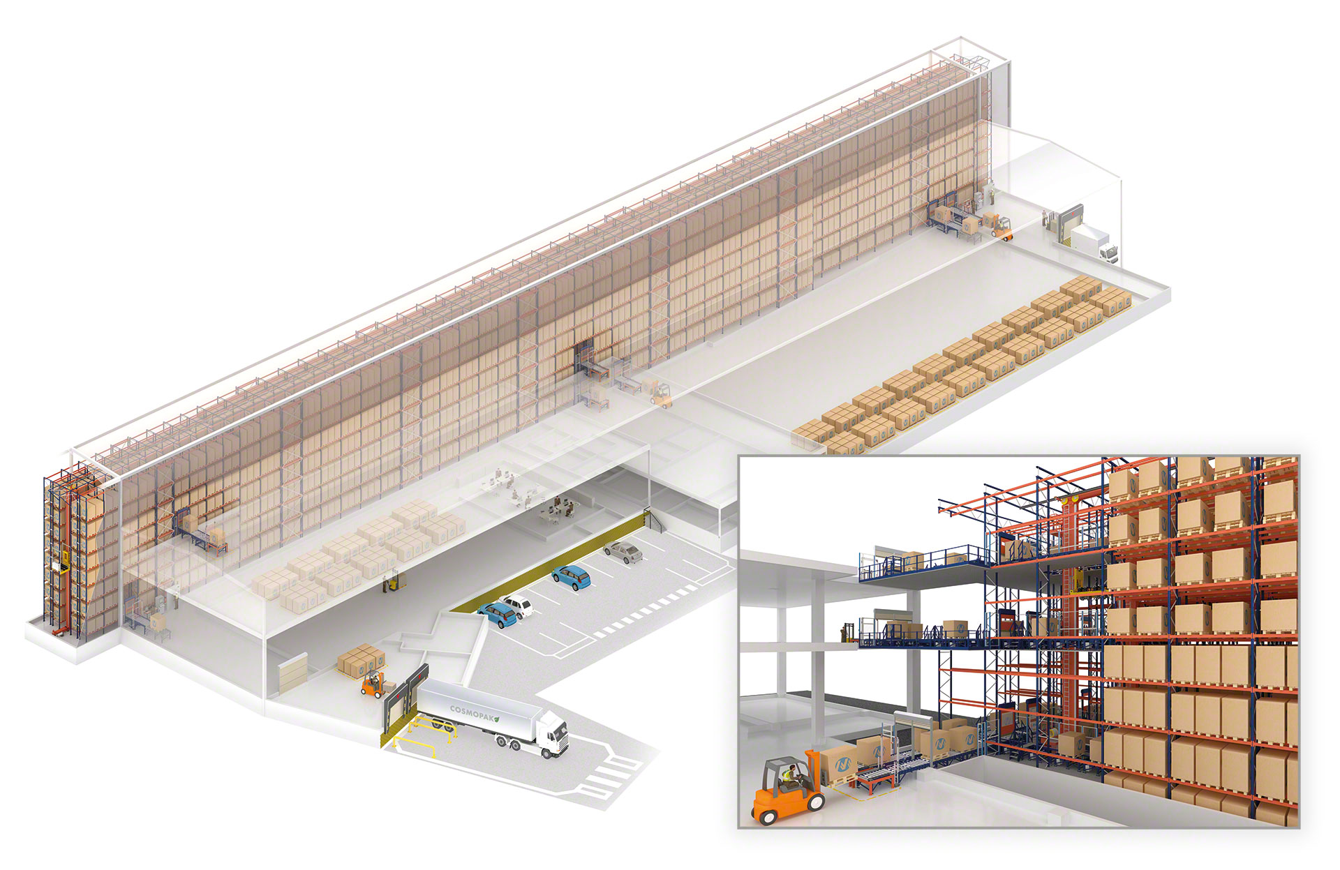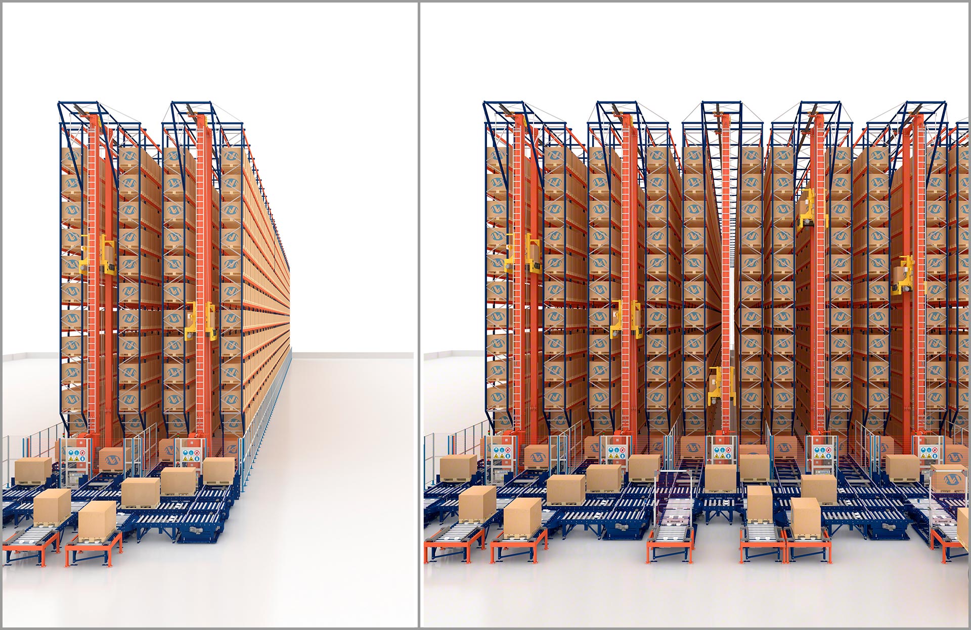 - Segurança: os transelevadores manipulam as paletes com extrema precisão e reduzem significativamente a circulação de veículos de movimentação, o que reforça a segurança do armazém.