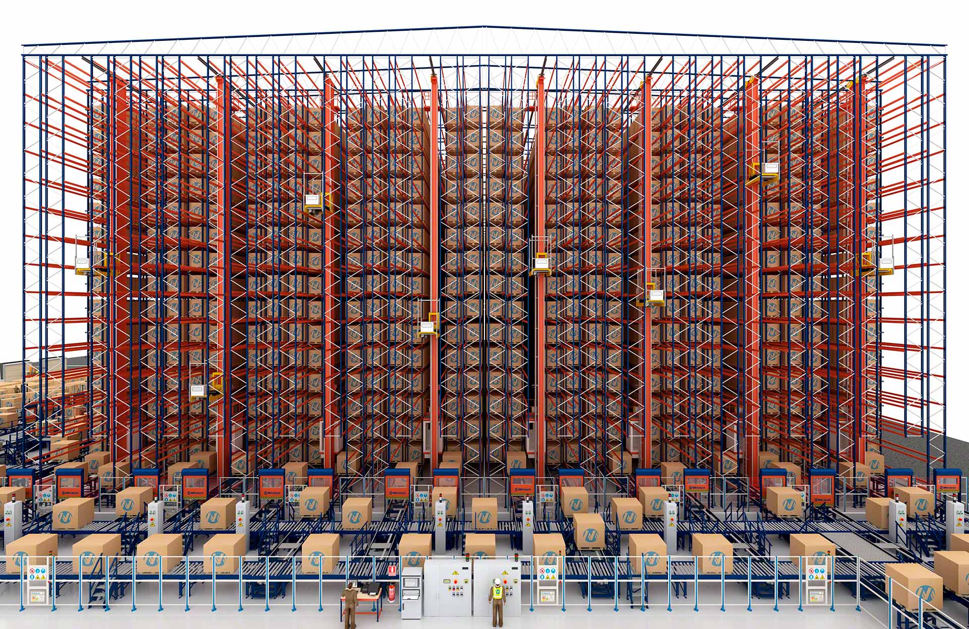 - Máximo aproveitamento do espaço: os transelevadores podem alcançar até 45 m de altura em corredores de apenas 1,5 m de largura.