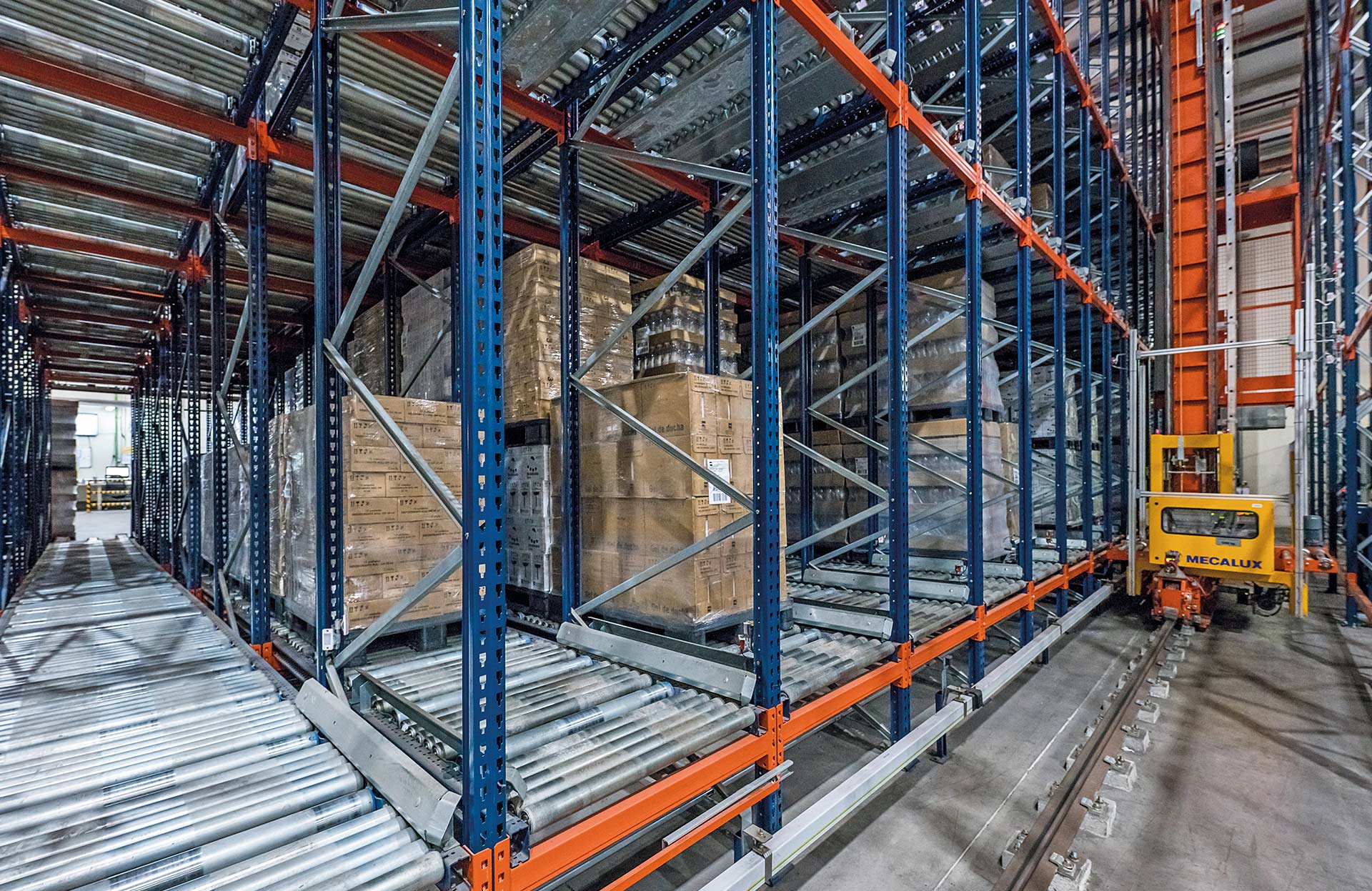 Os transelevadores da Mecalux podem operar em porta-paletes de profundidade simples ou dupla, porta-paletes dinâmicos ou com o sistema Pallet Shuttle automático.