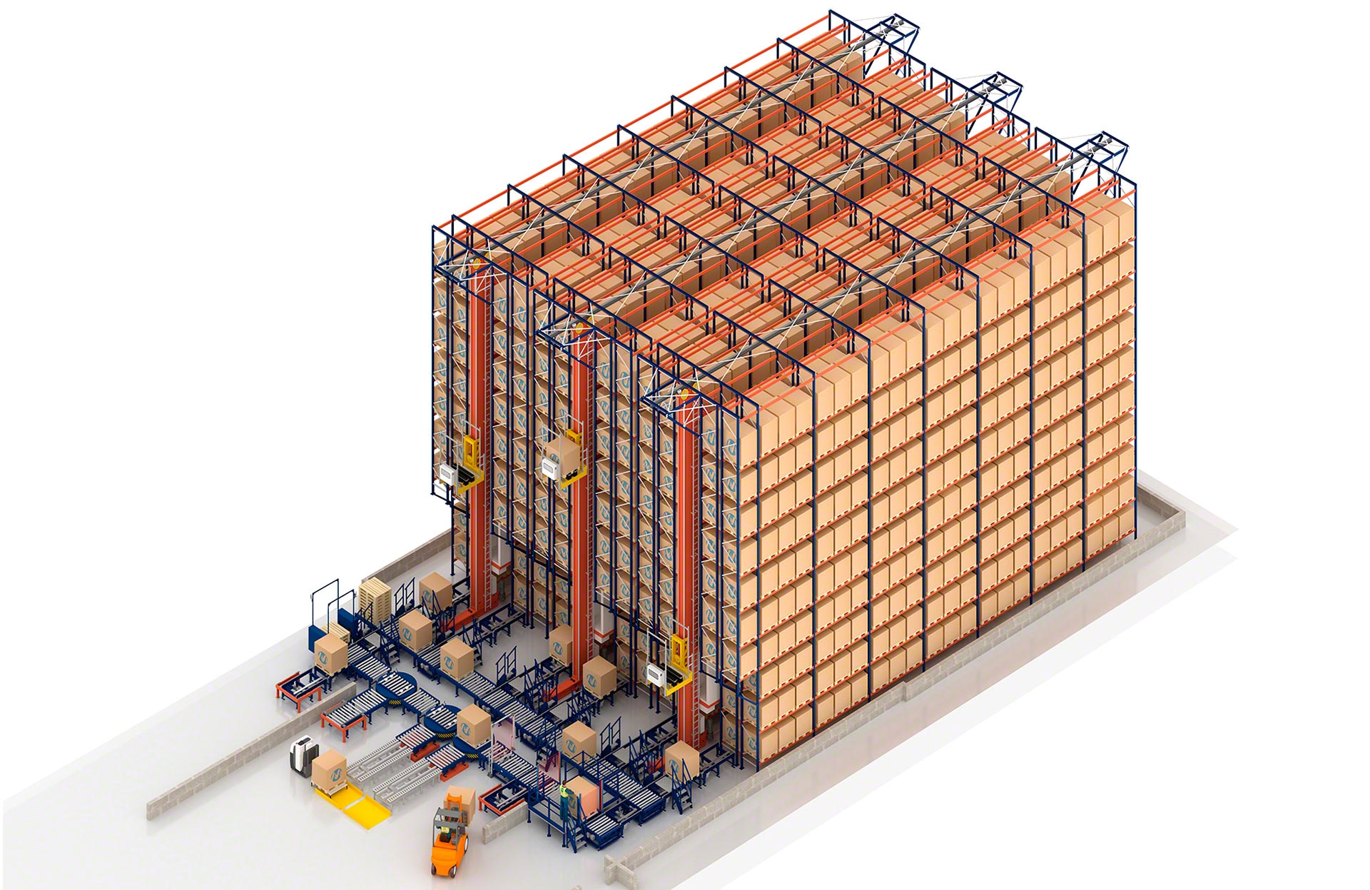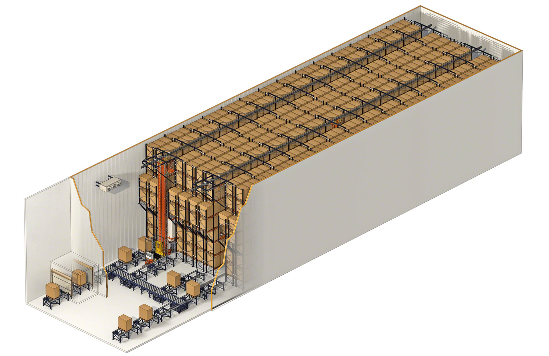 Sistema de armazenamento projetado para depositar e extrair paletes de forma totalmente automática que aumenta a produtividade e a capacidade do armazém.