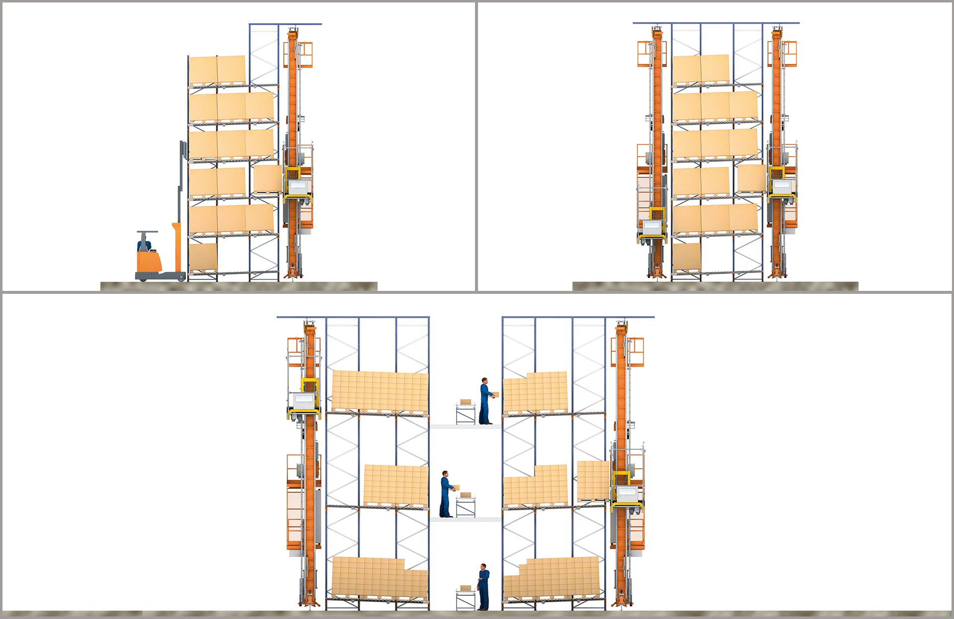 - Profundidade dupla e multiprofundidade: podem operar em estantes de alta densidade com canais de grande profundidade, como as estantes dinâmicas ou o sistema Pallet Shuttle, bem como em estantes de profundidade simples ou dupla.