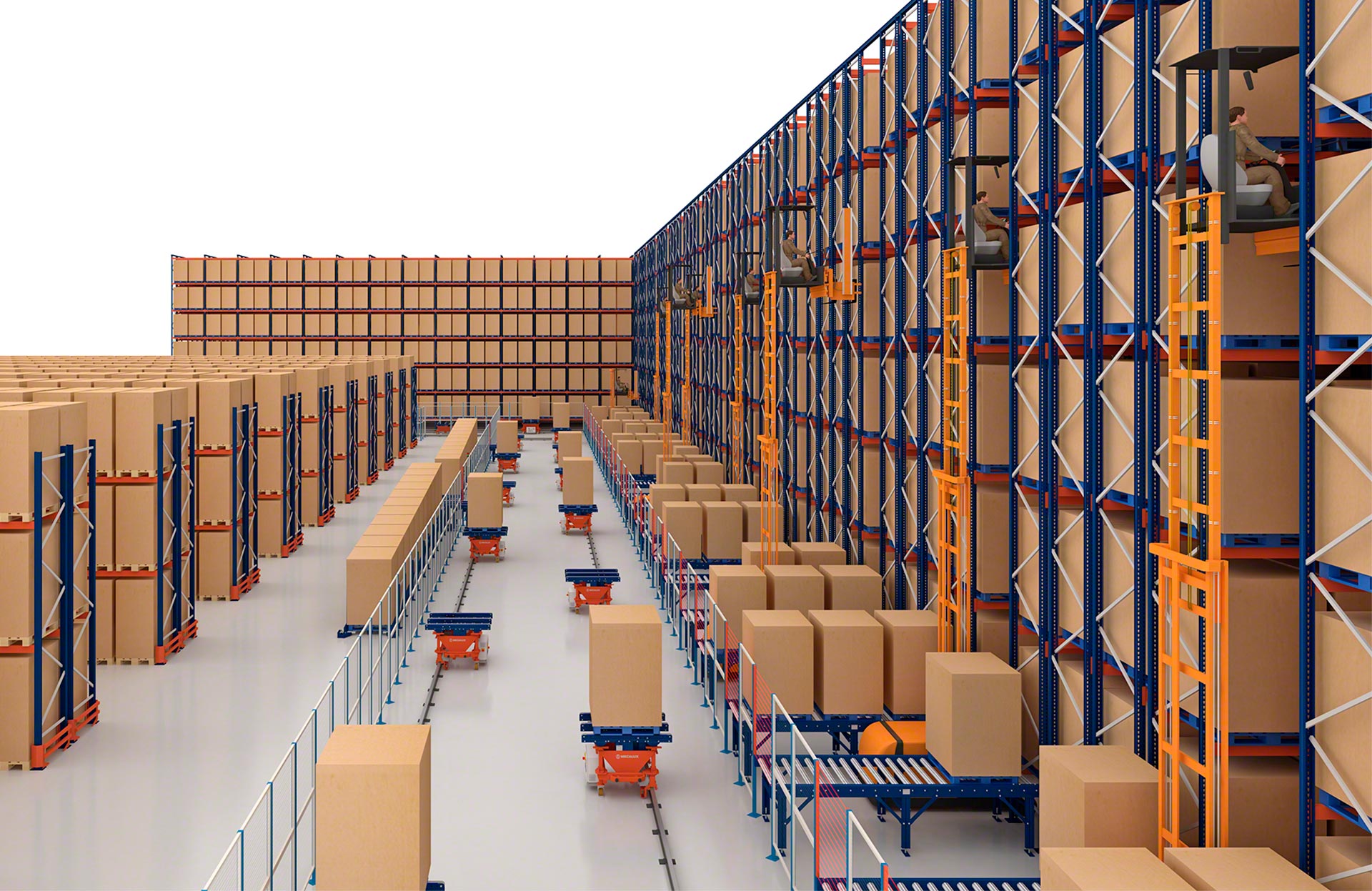 Sistema de transporte que automatiza e agiliza o fluxo interno de paletes por meio de carros autopropulsados que circulam por carris eletrificados.