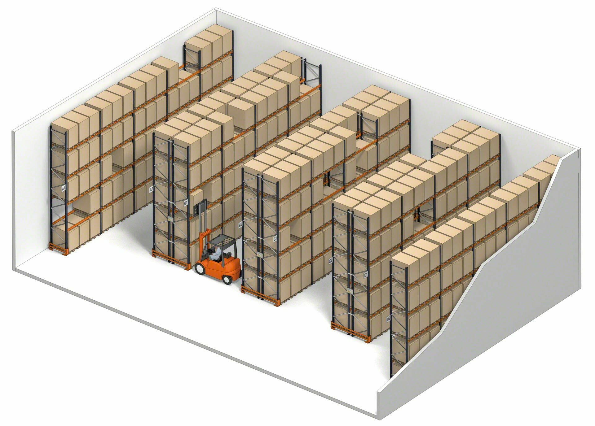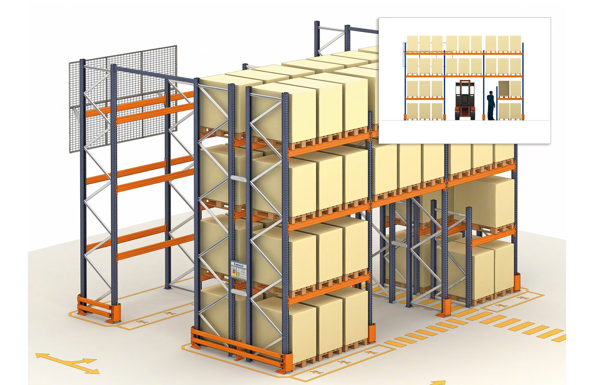 - Acesso direto a cada palete: todas as paletes são acessíveis a partir do corredor de trabalho.