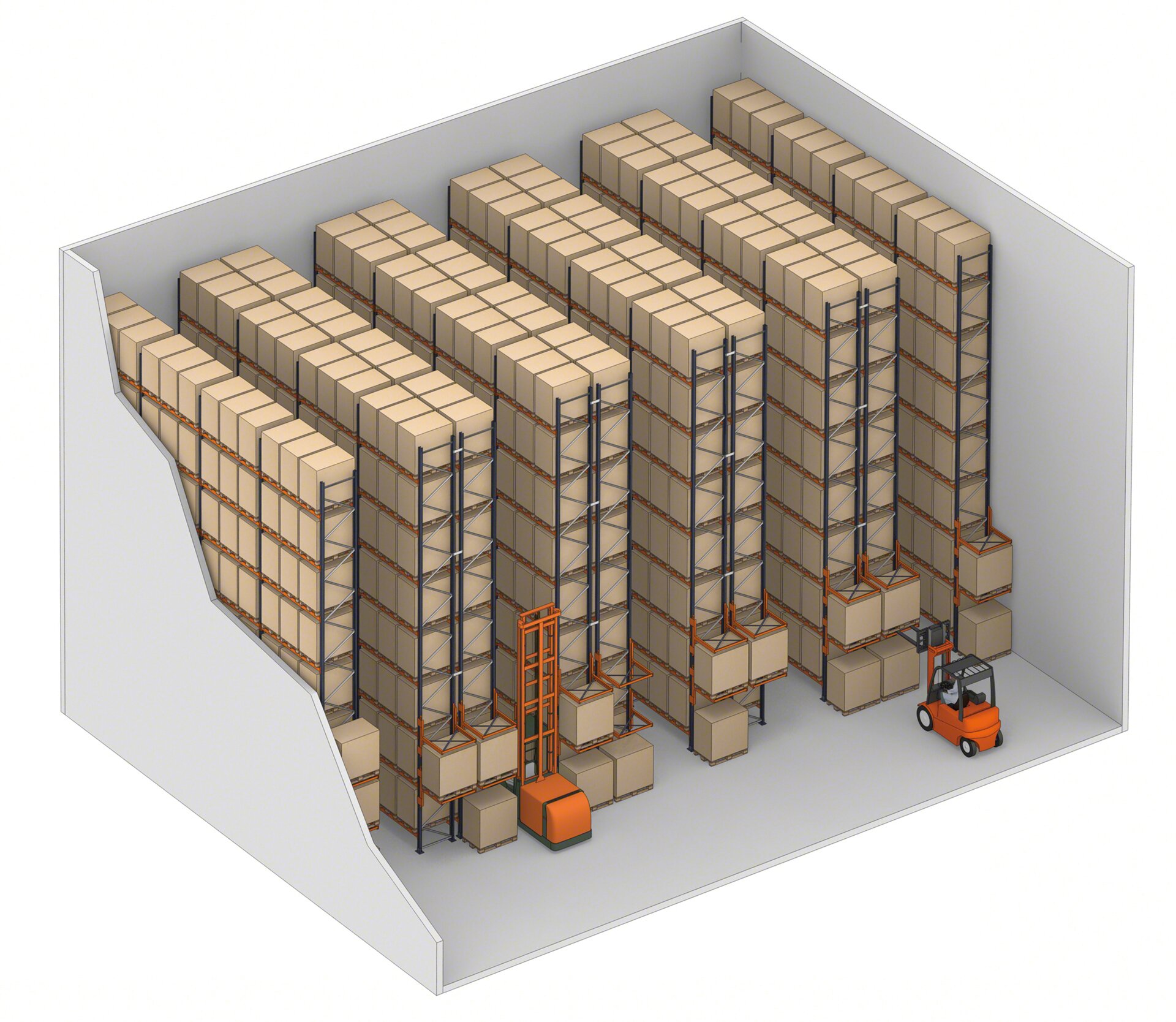 Pode ser utilizado qualquer tipo de empilhador (contrapesados, retráteis, tipo torre, etc.), desde que o corredor tenha a largura adequada e as máquinas possam atingir os níveis de carga superiores. No caso das estantes de profundidade dupla, o empilhador utilizado deve ter garfos telescópicos para aceder à palete mais distante.